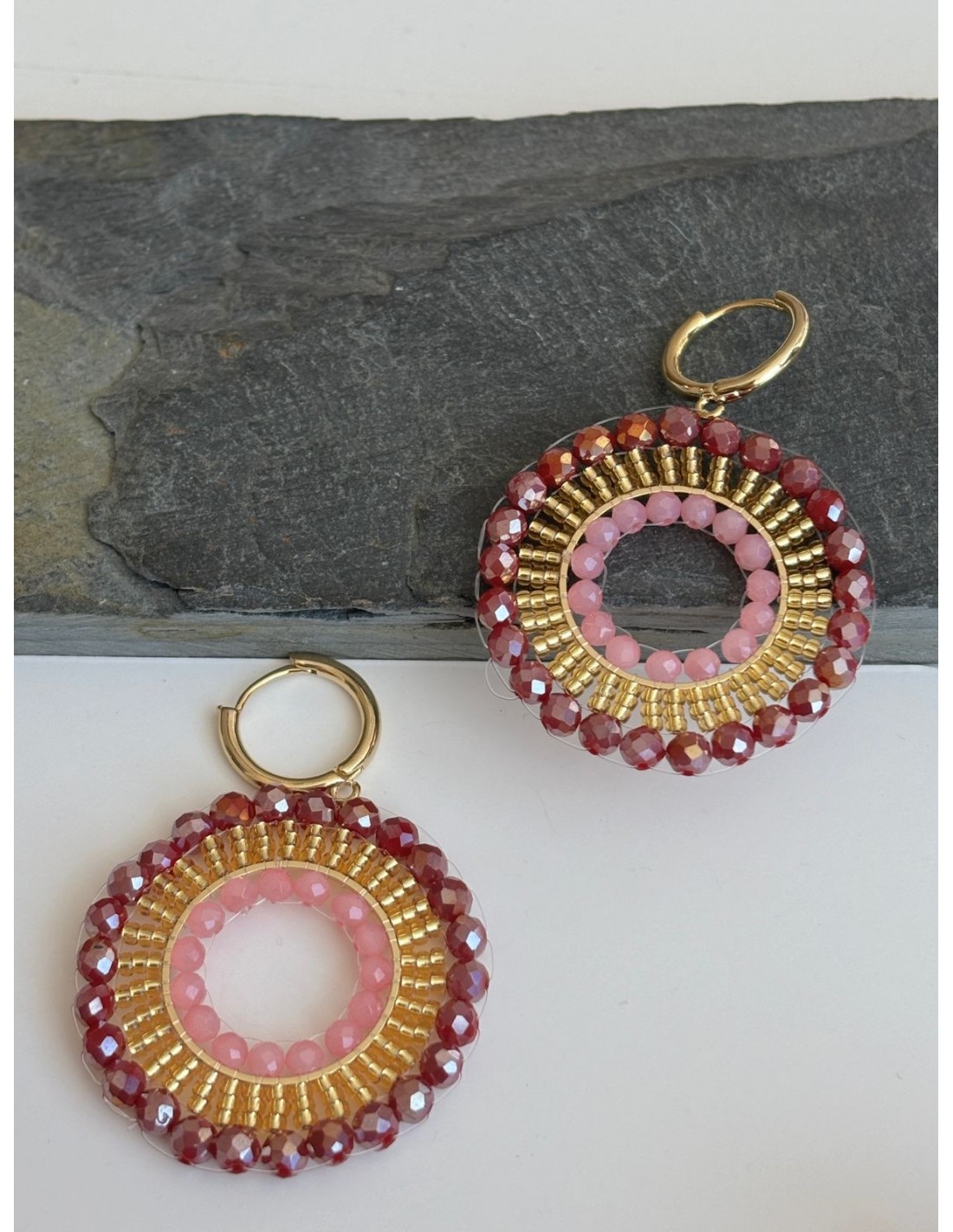 AROS BAÑADOS EN ORO CRISTALES CAFÉ Y ROSADOS