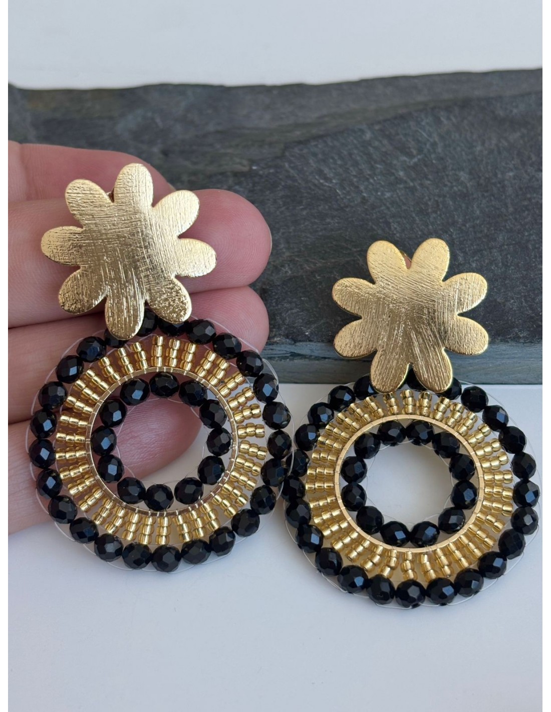 AROS BAÑADOS EN ORO CRISTALES NEGROS